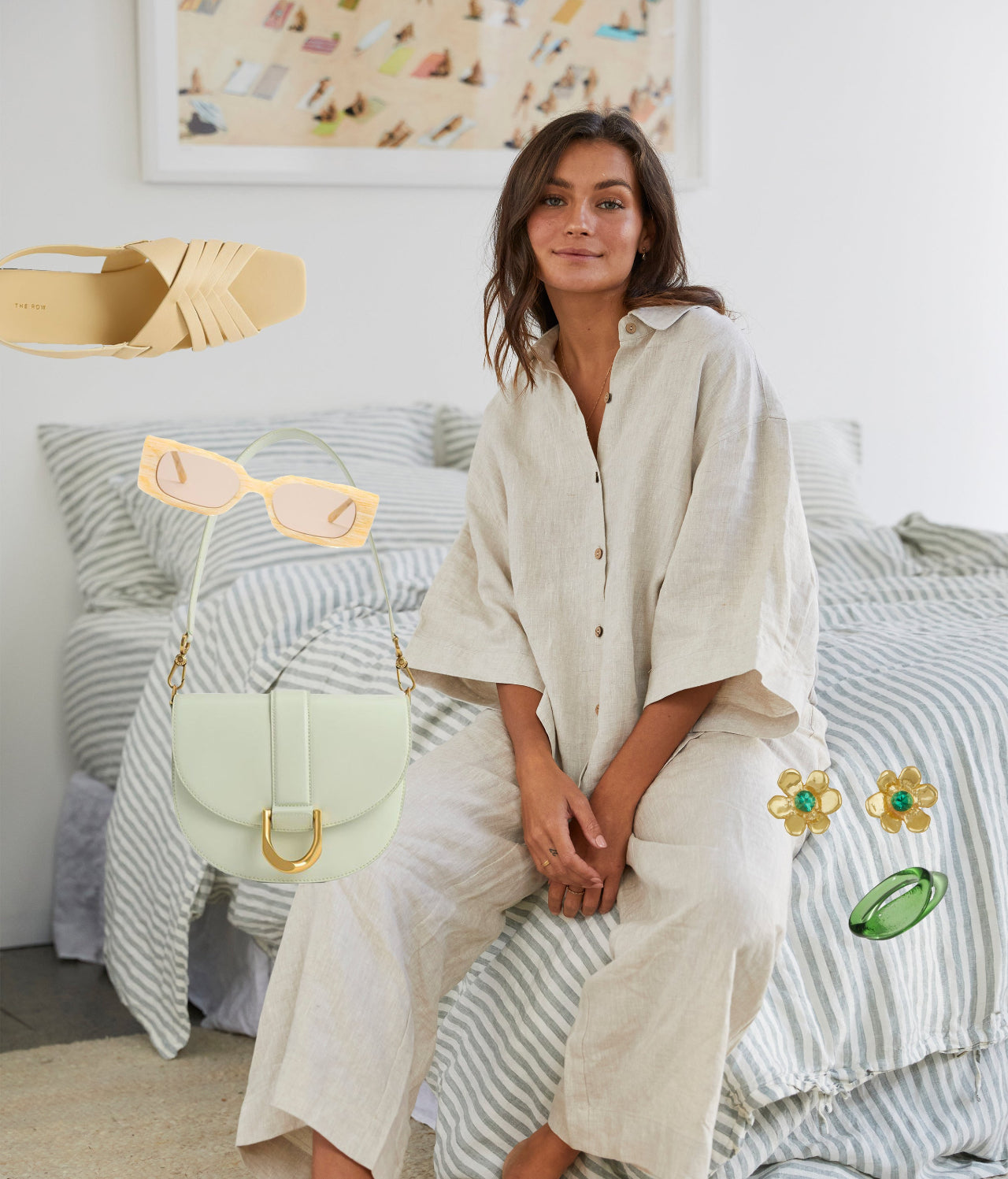 How to style: Live an Italian summer daily and manifest a European vacation by styling our French Flax Linen Ruby Lounge Set in Natural with creamy off white sunglasses and leather flats, adorned with a myriad of green jewellery and a practical off shoulder bag.