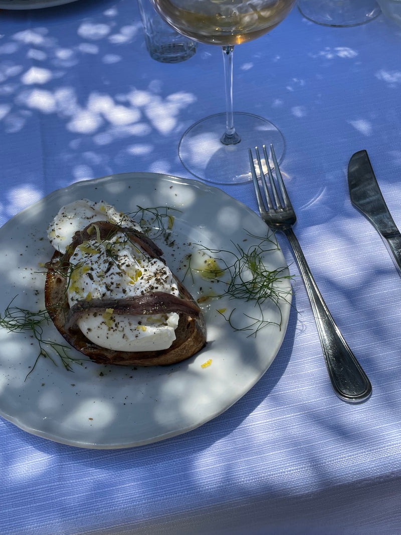 Wake-up time is around 8 am. We'll start the day slowly with a cup of chamomile tea or black coffee. Some guests might get up even earlier to watch the beautiful sunrise over the sea. This view gets me every time. Sometimes, we'll take our coffee and just stroll down the hill toward the sun. It feels very meditative – almost a bit emotional. Then, after starting the day sunkissed, we'll prepare our daily breakfast, which usually consists of homemade granola, fresh fruits, homemade raw chestnut honey, ricotta, soft-boiled eggs, and a few slices of sourdough.