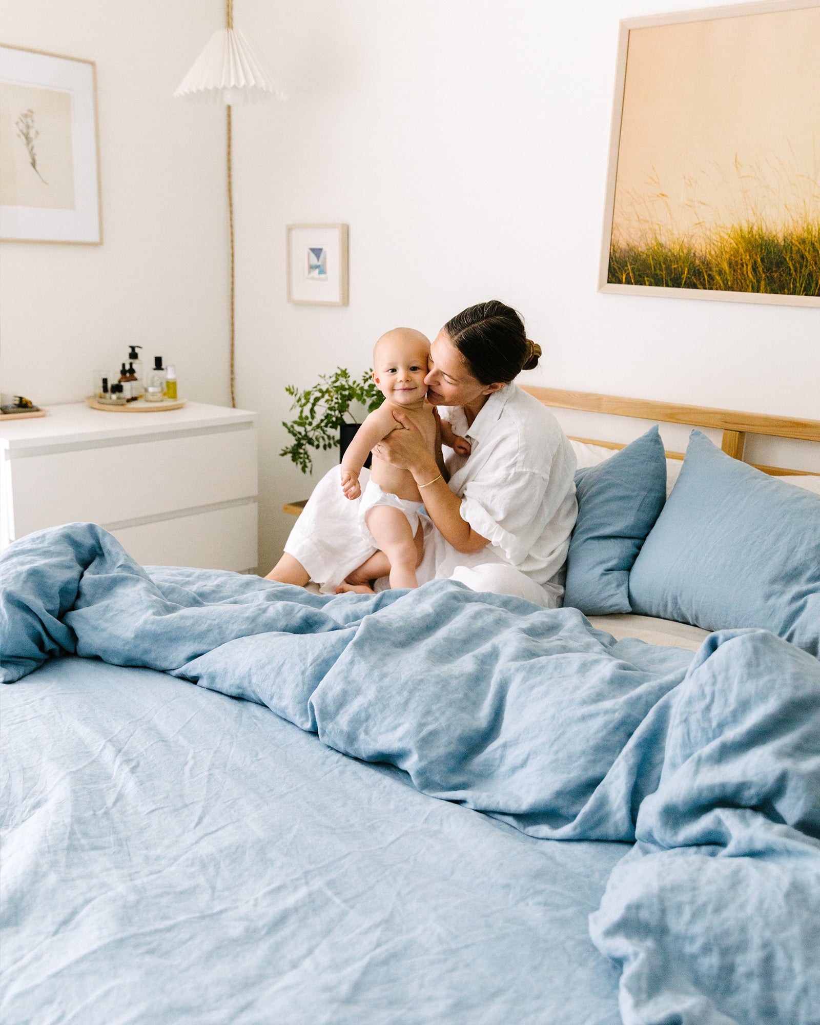 Below shop our French Flax Linen Table Cloth in Beige Gingham and Quilt Cover Set in Marine Blue