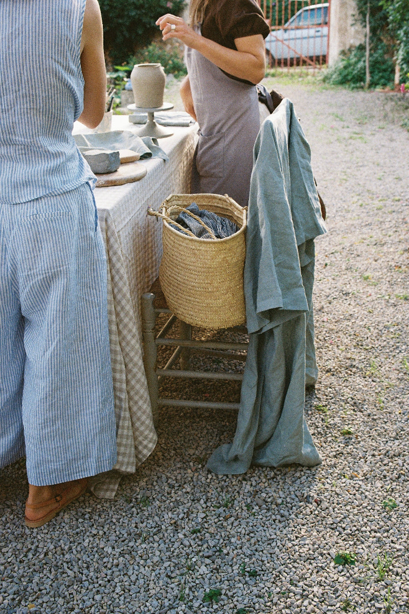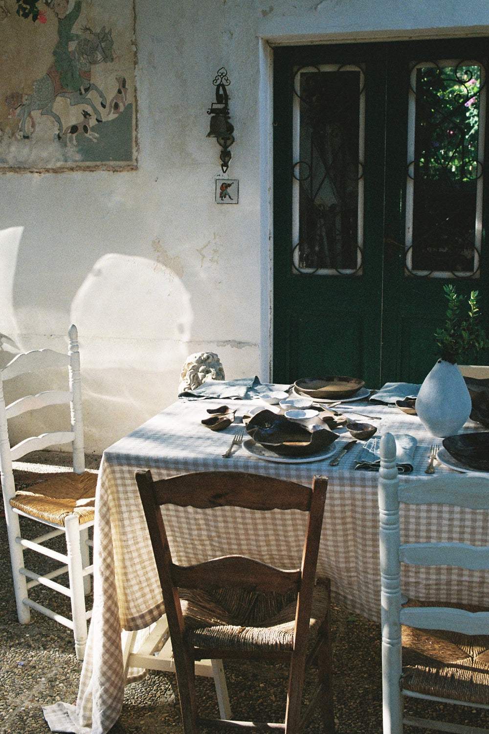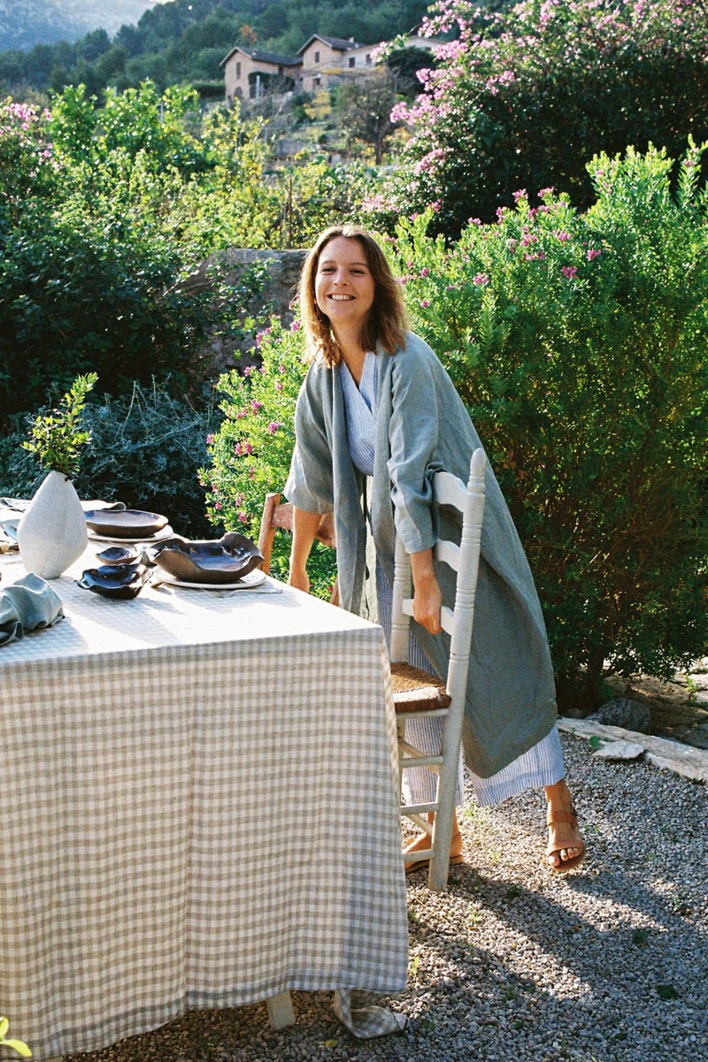 Below: Lisa wears our French Flax Linen robe in Sage, and the table is styled with our French Flax Linen Tablecloth in Beige Gingham.
