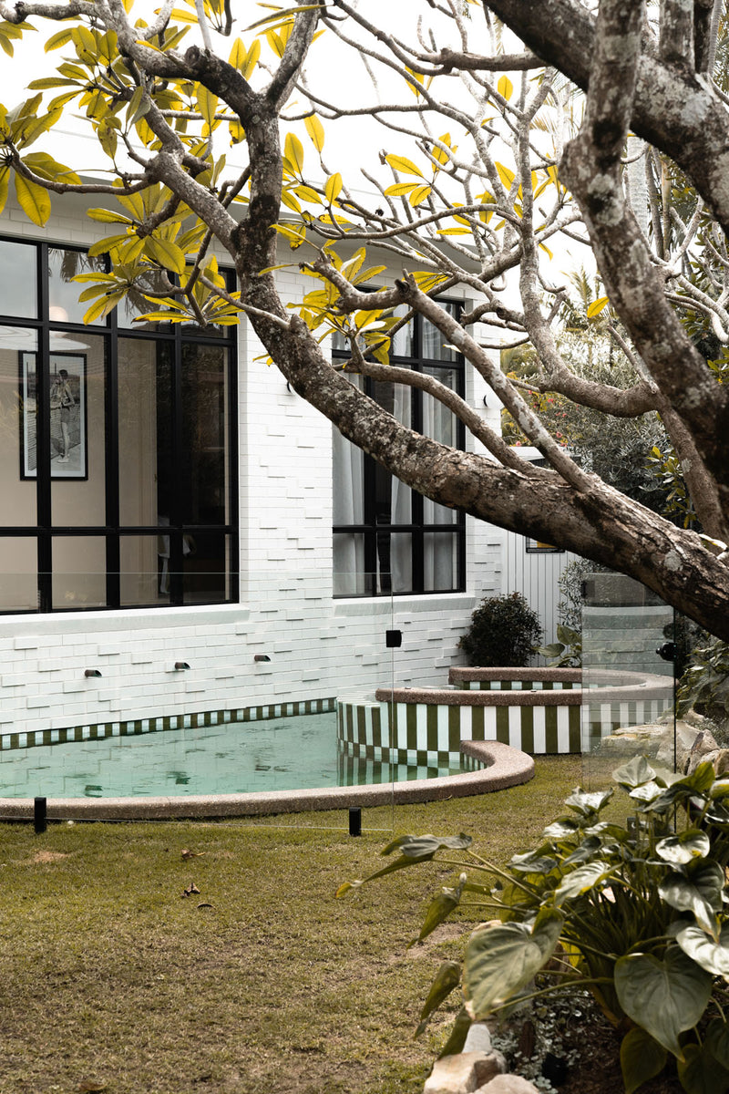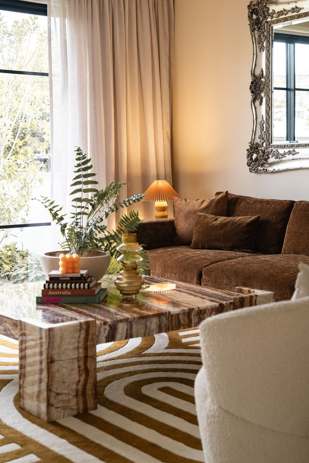A: It's hard to choose just one room of Allambi House but if I had to pick, the second living room is one room I'm obsessed with. It boasts a huge mustard geometric patterned rug, our stunning pink marble coffee table, combined with the tobacco velvet sofa and it's such a luxurious room. It gives me Mid-Century Hollywood vibes.