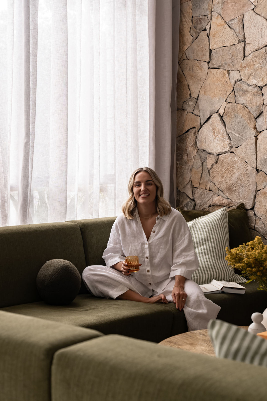 Perri wears our Ruby Lounge Set in White and styles her velvet sunken lounge with an Ivy Stripe Euro Pillowcase