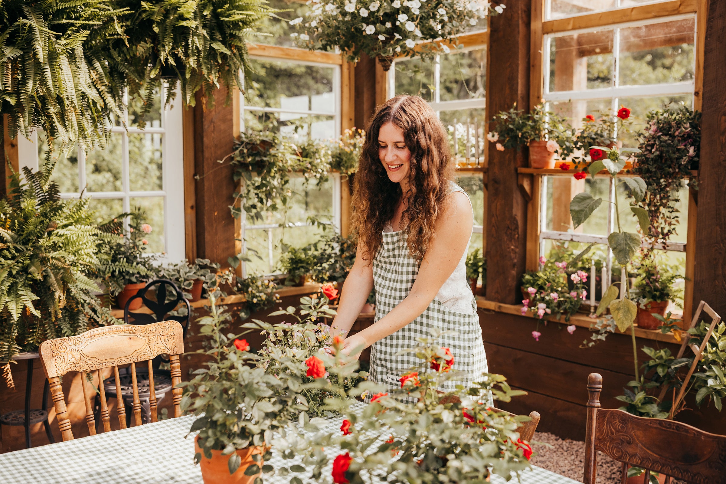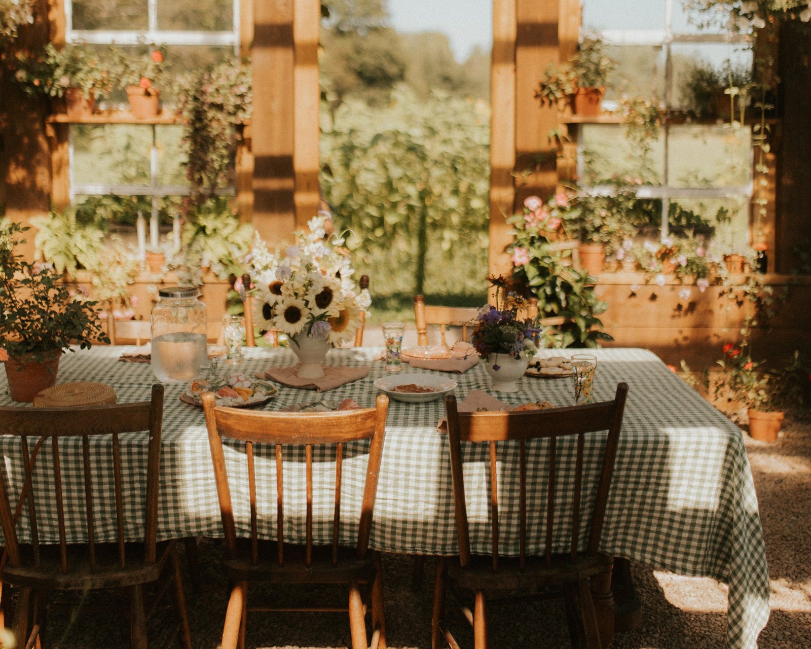 Below: The light-filled greenhouse is adorned with our Ivy Gingham Table Cloth to create an enchanting garden dining setting.