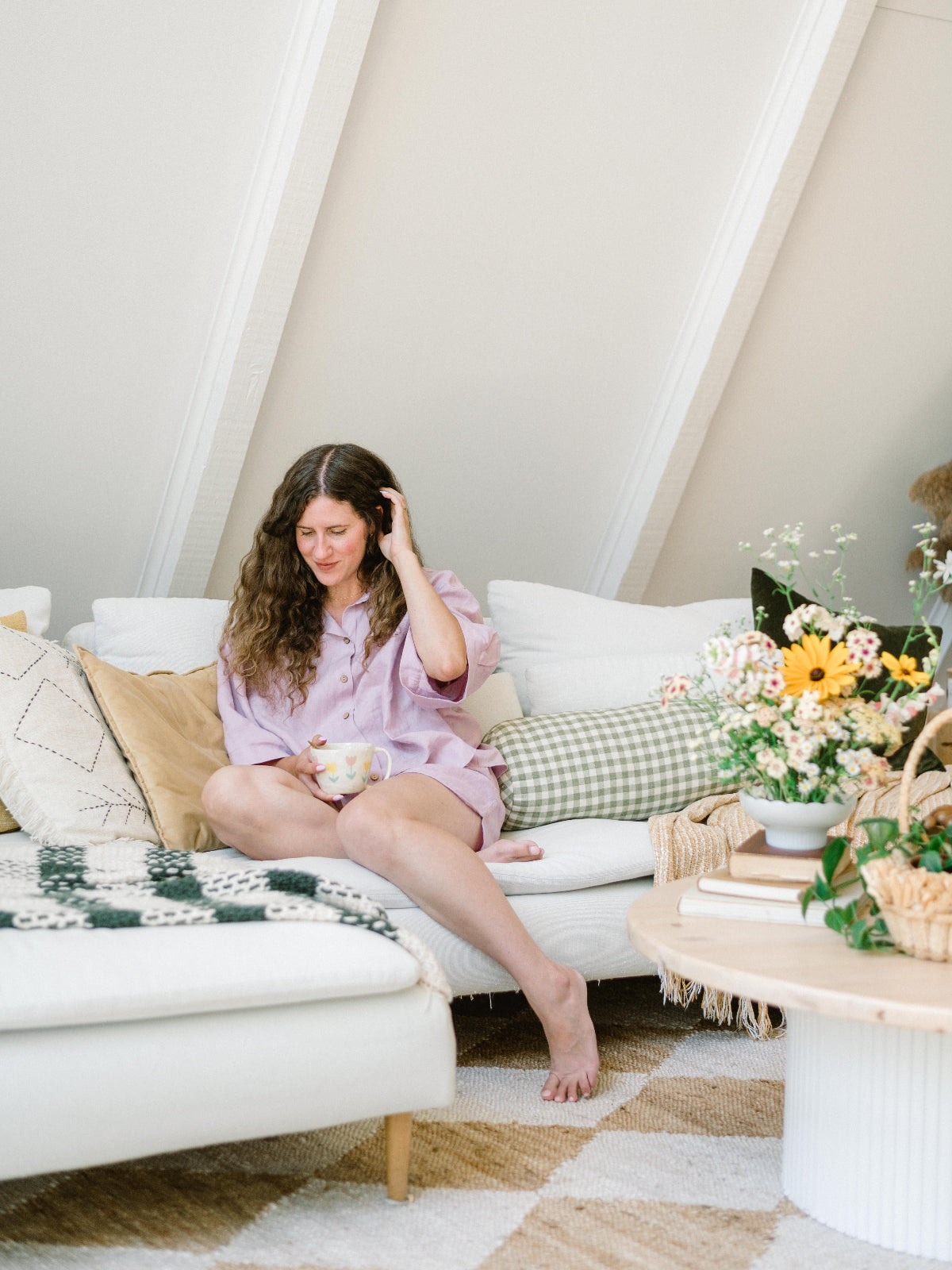 A: Oh, I truly love a wind down routine that involves time spent sitting on the deck with a cup of decaf tea, enjoying the sunset. Listening to the birds sing. A slow walk around the gardens to see what blooms have opened up throughout the day. Being present and mindful, and spending time doing things I enjoy is such an important part of my evening. Practicing gratitude for everything we have. Climbing into buttery soft linen sheets and cuddling with our kitties is an absolute dream to polish off the day.