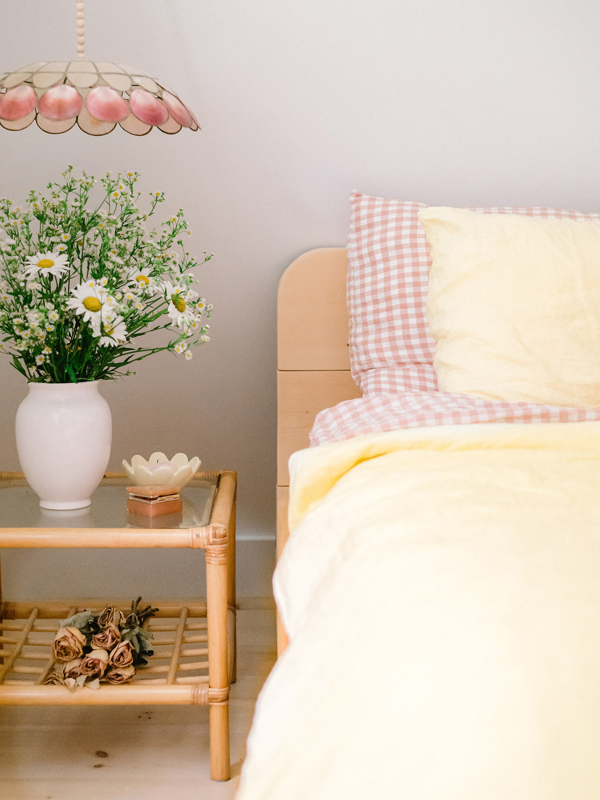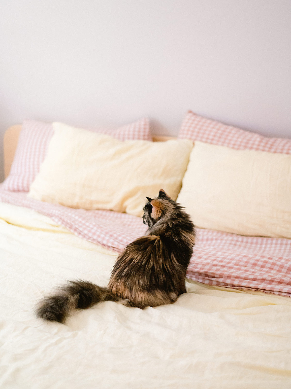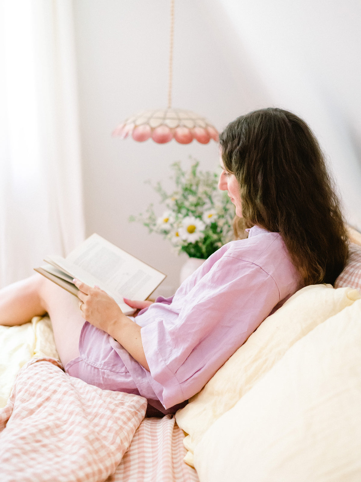 Katelyn wears the Ruby Set in Lilac as she styles her bed with a Clay Gingham Sheet Set and Daisy Quilt Cover Set.