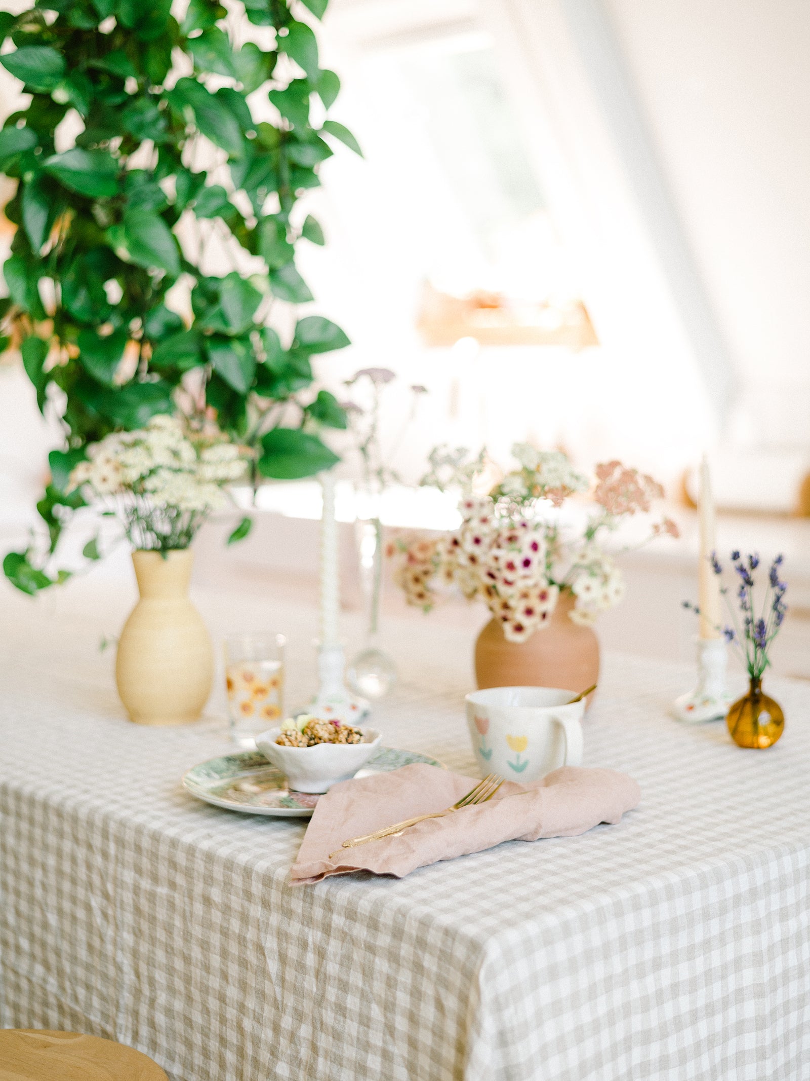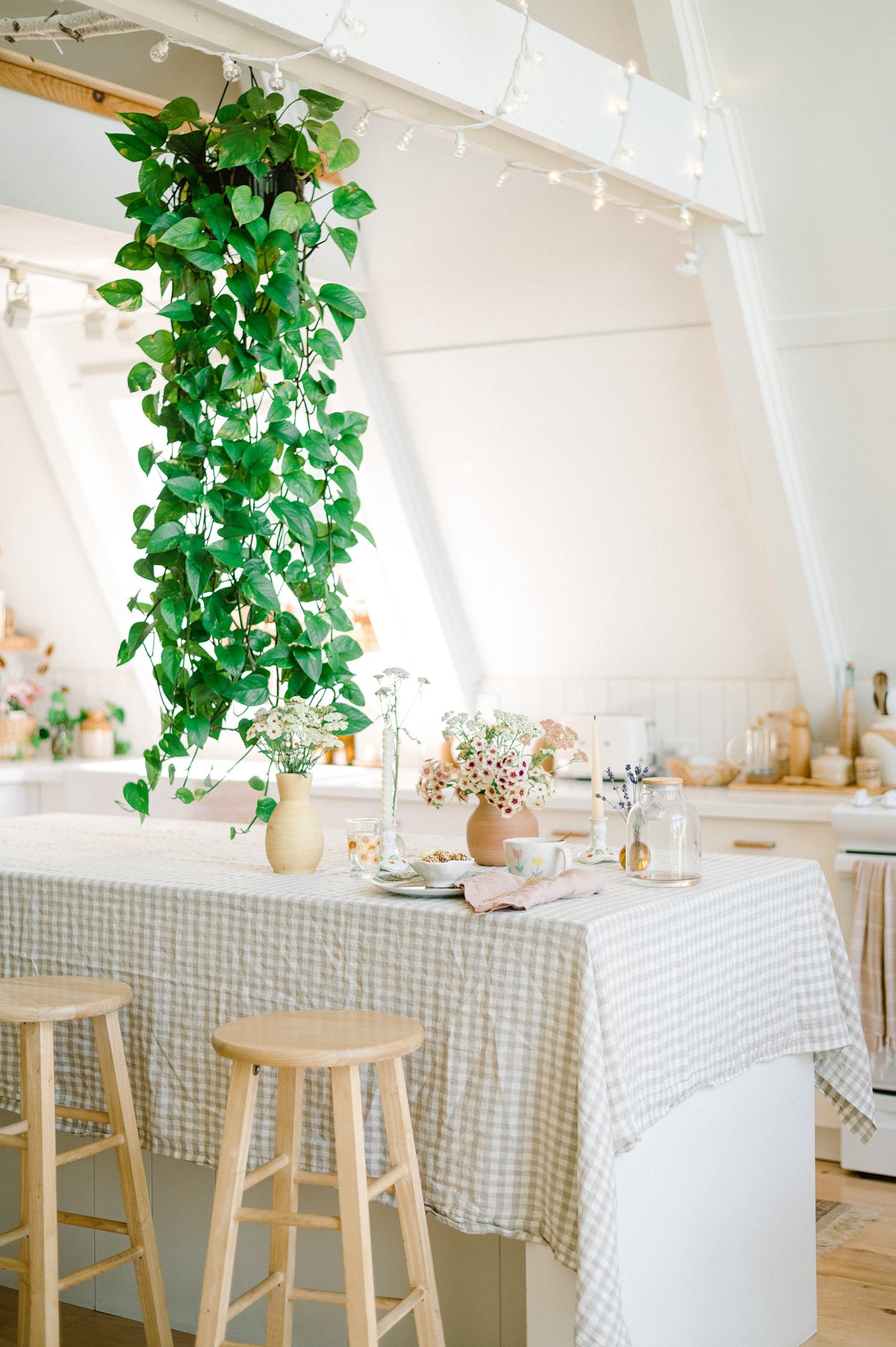 Katelyn's kitchen bench is styled with our Beige Gingham Table Cloth and Clay Napkins Set.