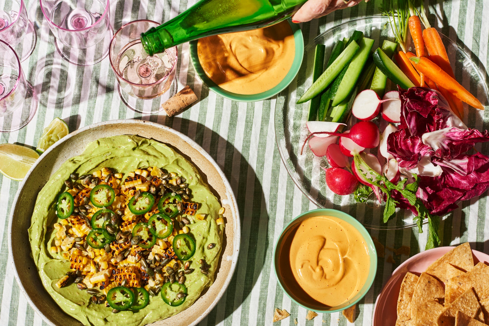 To make the guac, place all ingredients in a food processor and purée until smooth. Transfer to a serving dish, scraping out as much of the guac as you possibly can with a silicone spatula. Smooth the top of the guac with the back of a tablespoon and top with sliced jalapeños, corn and pepitas. Garnish with additional olive oil, as well as chilli flakes and coriander leaves, if desired. Serve with corn chips.