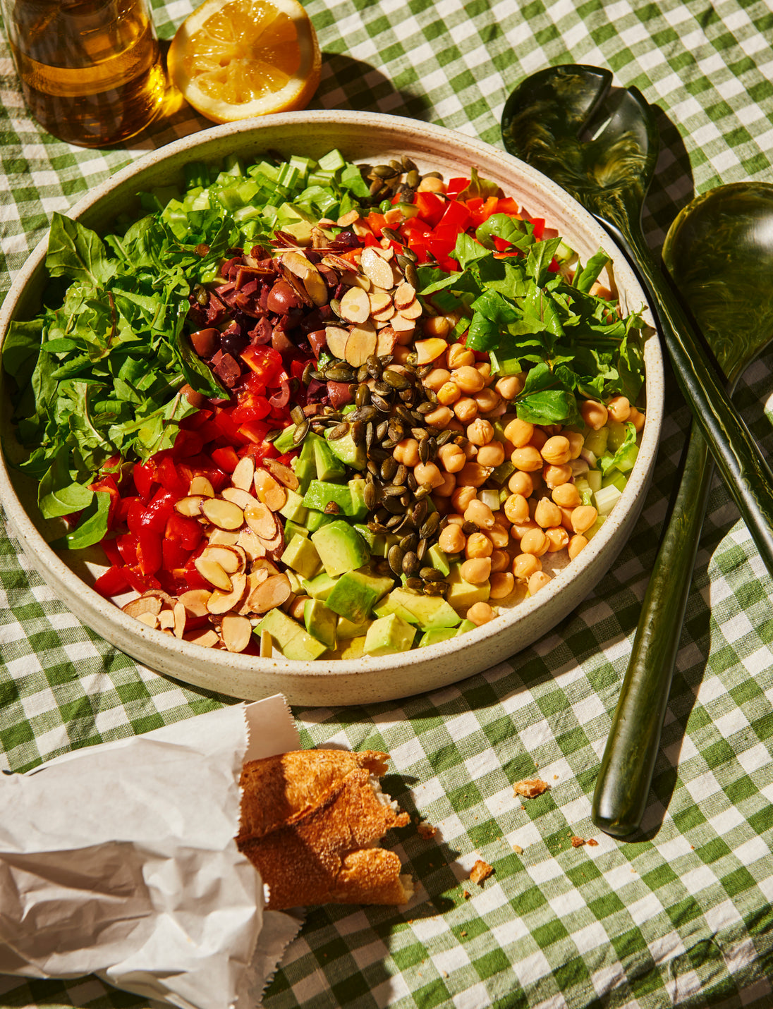 "This is one of my most regularly made recipes. The key to its greatness is chopping everything quite small, so you get a little bit of everything in every mouthful. It’s fresh and full of flavour, and filling while also being light, making it the perfect weekday lunch or dinner for post-indulgent times. While it doesn’t use a dressing per se, the red onion and olives pair perfectly with the lemon and olive oil to enhance the natural flavours of the fresh veggies the way a dressing would. It’s really something."