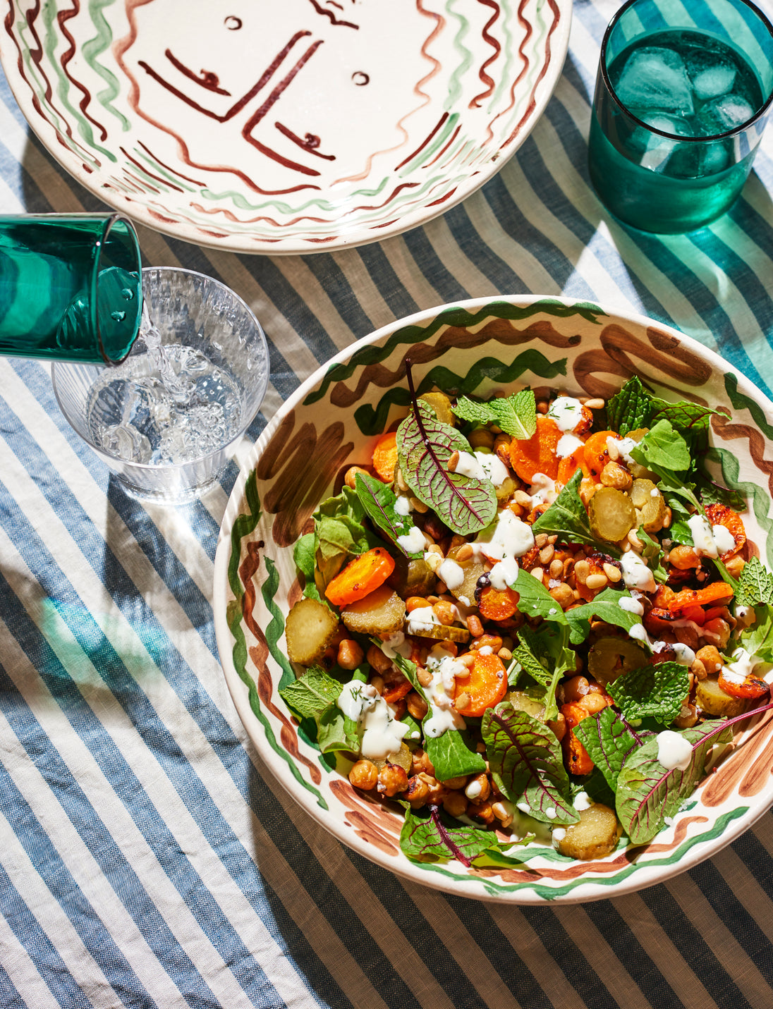 To make the salad, preheat the oven to 200–220˚C (390–430˚F). Put the chickpeas and carrots in a large mixing bowl, add the mustard, honey, salt and olive oil, and toss until the chickpeas and carrots are evenly coated. Transfer to a baking tray and bake for 20 minutes. Give the mixture a careful toss, add the pine nuts and return to the oven for another 5 minutes.