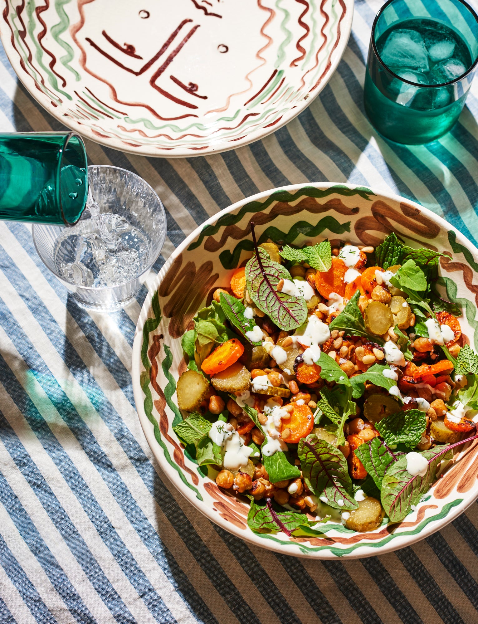 "This is an easy go-to for a quick lunch or dinner, and the perfect way to transform those forgotten carrots that are going floppy in the bottom of your vegetable drawer. The sweet tang of the honey mustard complements the earthy flavours of the carrots and chickpeas, and the way these two nestle together after they’ve been roasted and dressed makes this salad a pleasure to eat. With the addition of fresh mint and rocket (arugula), the pop of pickles and the dreamy, creamy, tangy and addictive GOAT dressing, it’s also easy to double if feeding a crowd."