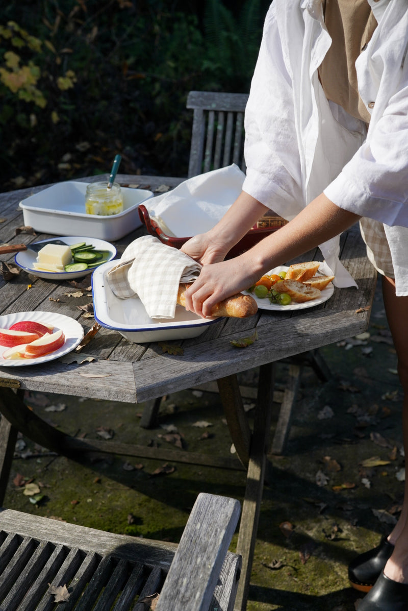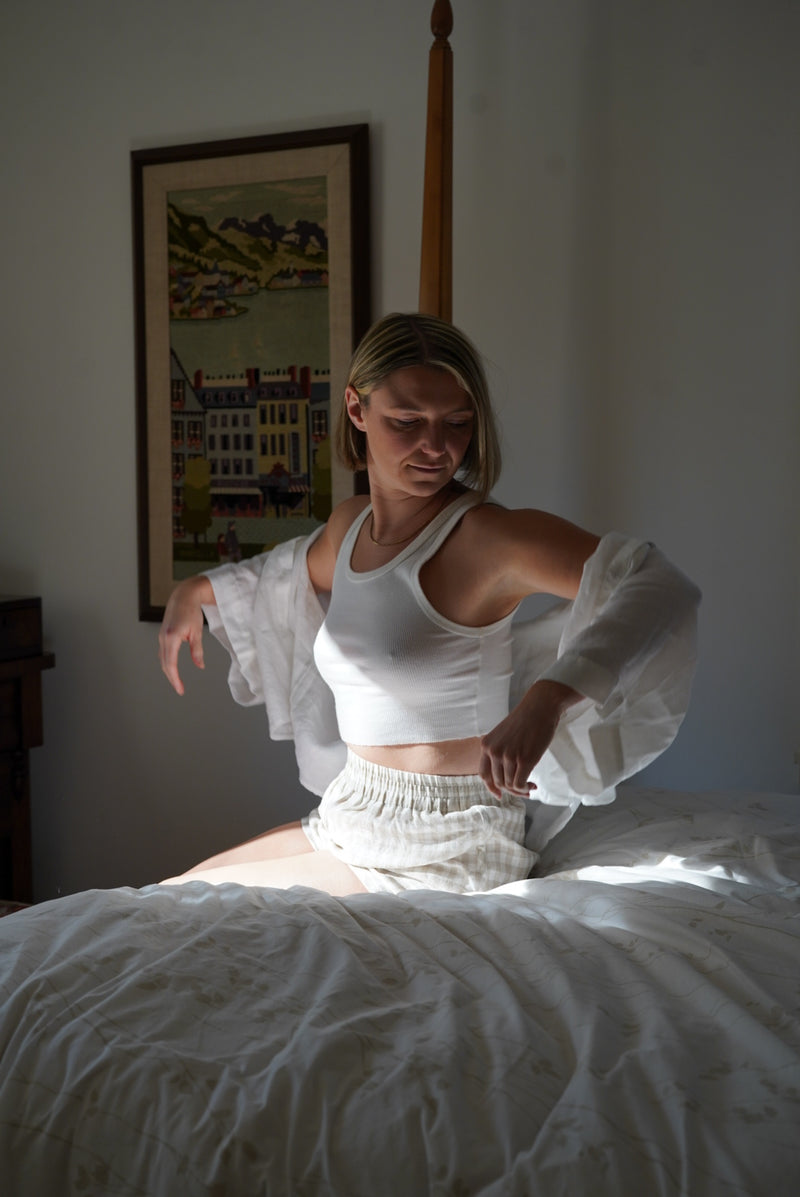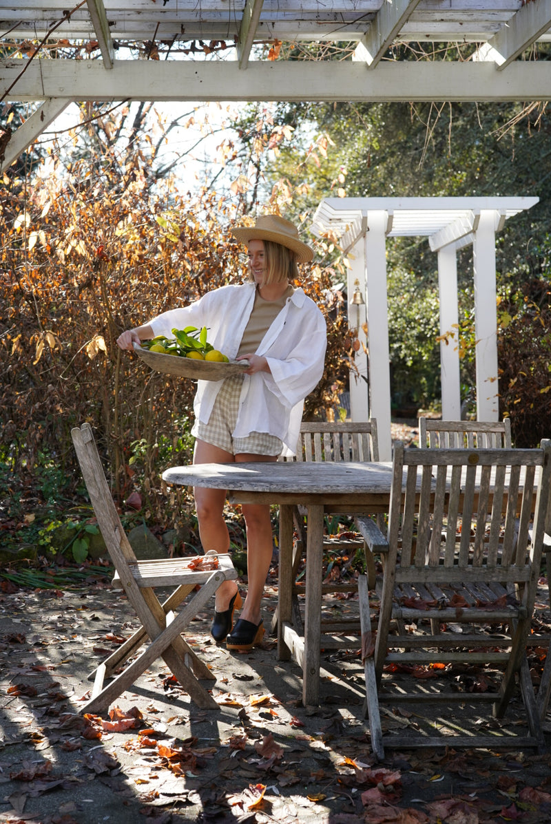 Below Rebecca wears our Ruby Shirt in White with Relaxed Shorts in Beige Gingham and styles her table with our Beige Gingham Napkins Set.