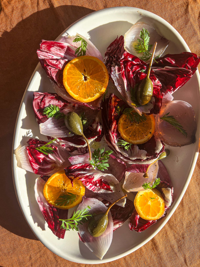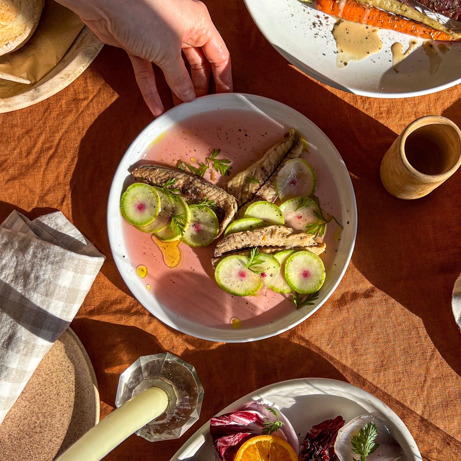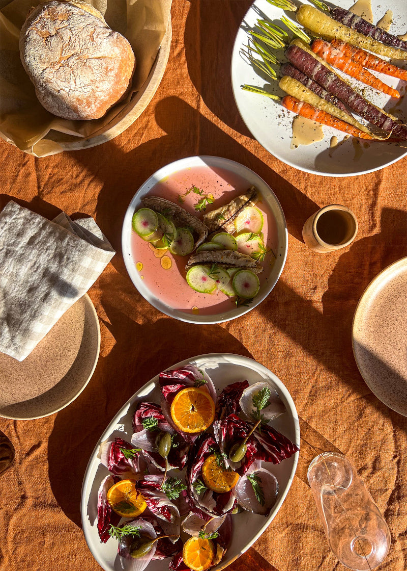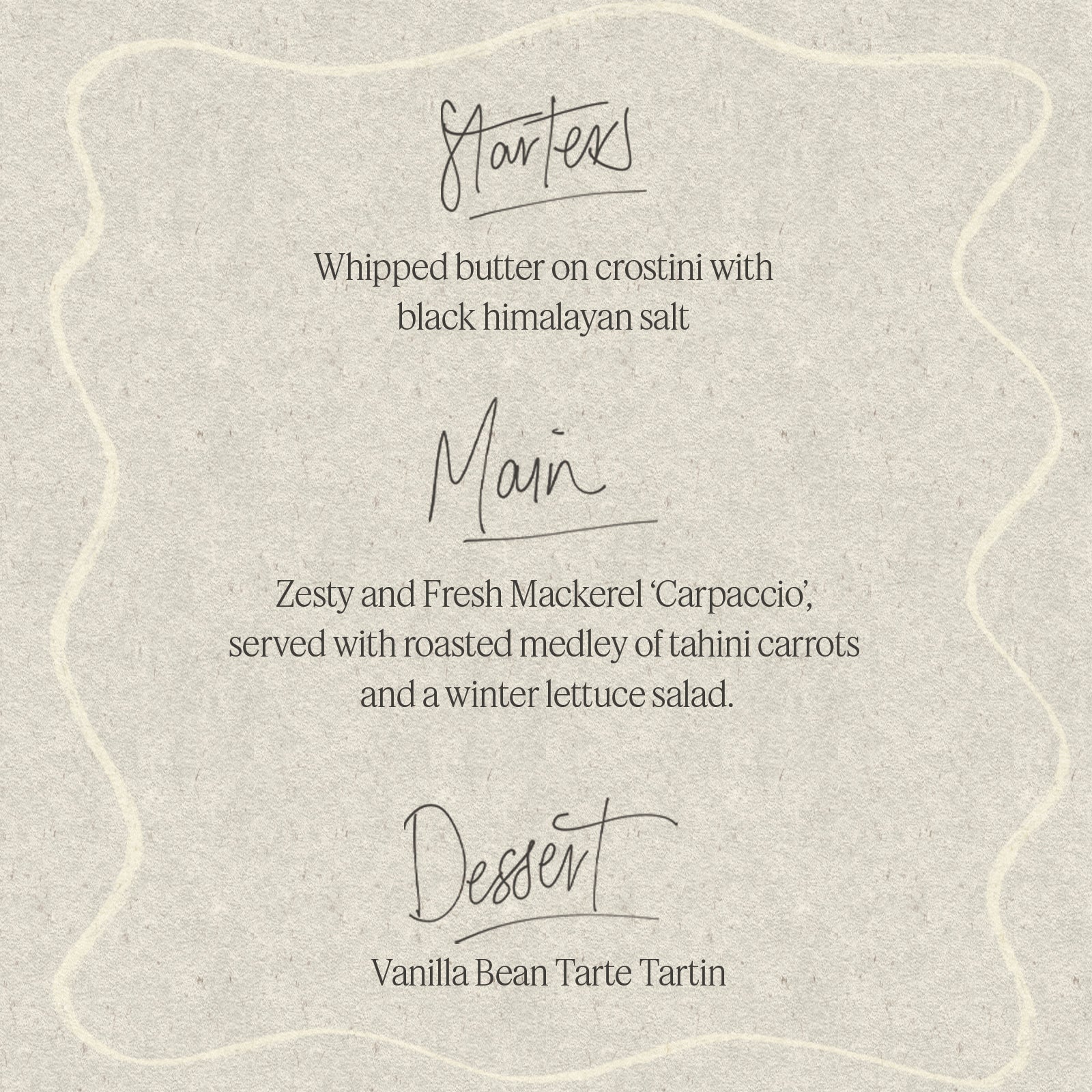 Taylor says “In the kitchen I’m a free spirit. Designing a menu is a lot like getting dressed. I think about the layers and textures before anything else. Tinned fish is a staple on my shelf so this menu is based around mackerel in a pink vinaigrette. Alongside there’s a winter lettuce salad, tuscan bread, and roasted tahini carrots.