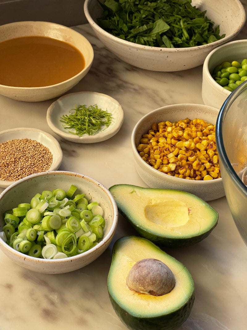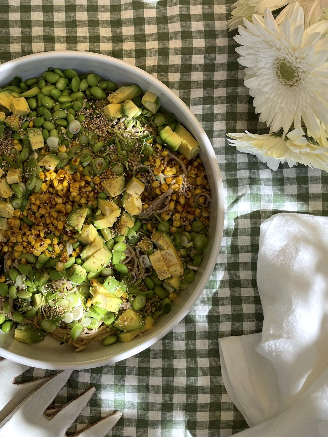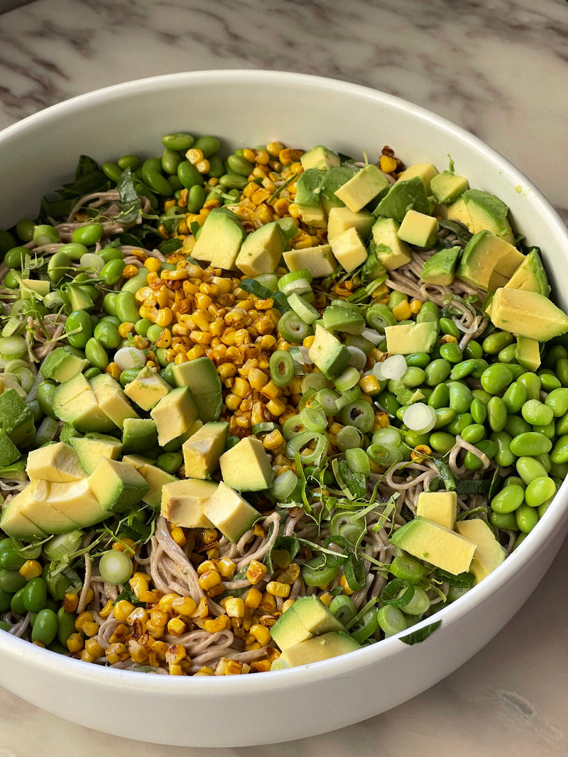 Vibrant Soba Salad with Edamame, Corn, Spinach, Avo, Sesame